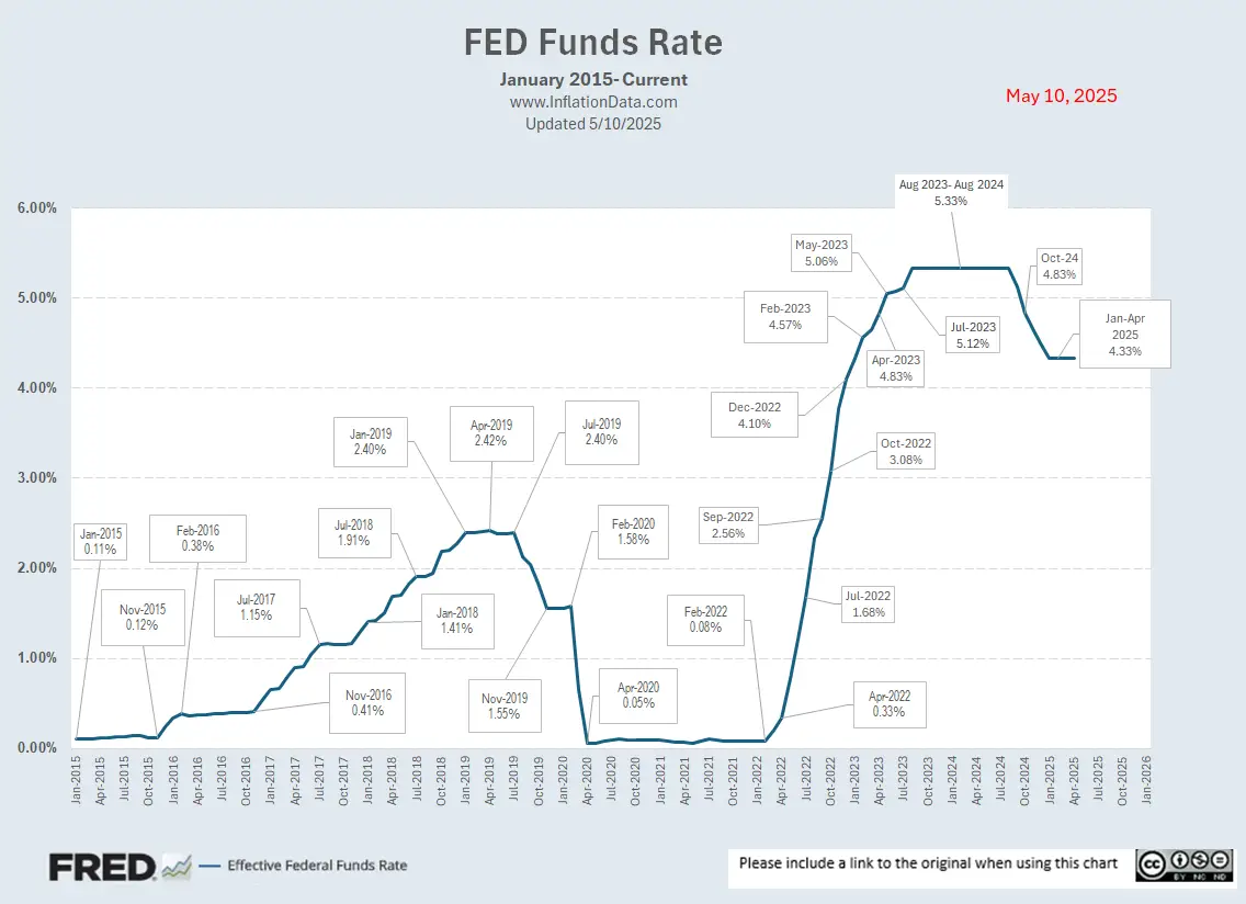 On May 7, 2025, the Federal Open Market Committee held the FED funds target rate at 4.25% to 4.50%, a level unchanged since December 2024. In his statement, Chairman Jerome Powell said that, while economic growth remains solid, uncertainty has risen markedly amid evolving trade policies and global supply-chain strains saying, “If the large increases in tariffs that have been announced are sustained, they’re likely to generate a rise in inflation, a slowdown in economic growth and an increase in unemployment.” Chair Jerome Powell underscored at the post-meeting press conference that the current policy stance is “in a good place” but that the Fed will “await further clarity” before altering rates.