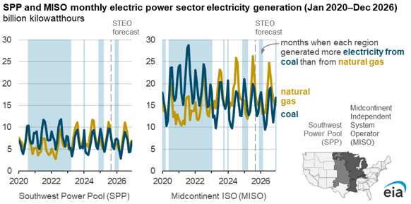 As recently as 2021 and 2022, both SPP and MISO were producing more electricity from coal than from natural gas in every month of the year. More recently, coal has exceeded natural gas only in the winter months, when demand for space heating and related demand for electricity increase. In MISO and SPP, we expect coal generation to exceed natural gas generation from December 2025 through February 2026.