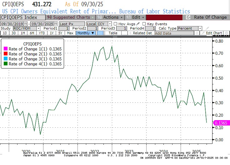 Well, it seems like it’s been a while since the last CPI update! Thanks to the government shutdown, it has been since this data is a week and a half later than it was scheduled to be. The importance of the CPI release is obvious, but it was reinforced by the fact it’s the only one the government is calling people back to release. It isn’t that we don’t have reasonably-accurate alternative ways to measure price pressures, though – it’s because unlike Payrolls and most other government releases that are important touchpoints for economists, the CPI is an important legal touchpoint for contracts, bonds, and legal obligations of the federal government. In this case, September’s data is a crucial number needed to calculate COLA adjustments for Social Security for next year. If this had been October’s data? I’m not sure they call back workers to release it. But that’s next month’s problem.