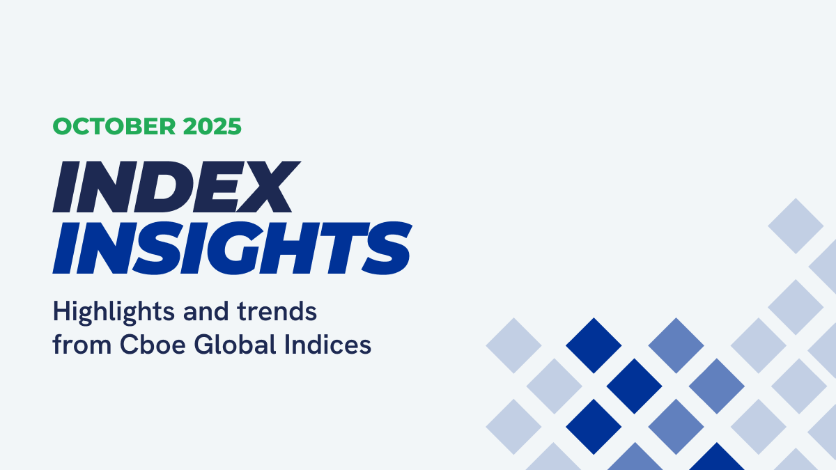 After a volatile start to the month, October turned out generally positive for equities investors. The S&P 500® Index finished the month up 2.27% at 6,840.20 and the Russell 2000® Index gained 1.76% to finish above 2,479. Both benchmarks were just shy of all-time closing highs in the final week of the month. Volatility increased early in the month during a sharp selloff on October 10 and remained elevated compared to September. The Cboe Volatility Index (the VIX Index) finished at 17.44, two points above the September average level but well off the 25-level highs touched earlier in the month. Higher premium levels combined with positive underlying performance led to gains in both Put-write and Call-write indices, including gains of more than 2% for the Cboe S&P 500 Buy-Write Index (BXM) and the Cboe S&P 500 Half Buy-Write Index (BXMH). Standout results were noted in the Cboe® MSCI Emerging Markets BuyWrite Index (BXEF) and Cboe Russell 2000 PutWrite Index (PUTR), both up nearly 3.5%. Unlike equities, crypto assets failed to regain favor with investors following the earlier weakness. The Cboe Bitcoin U.S. ETF Index (CBTX) dropped nearly 12% from early October highs, finishing down 4% on the month.
