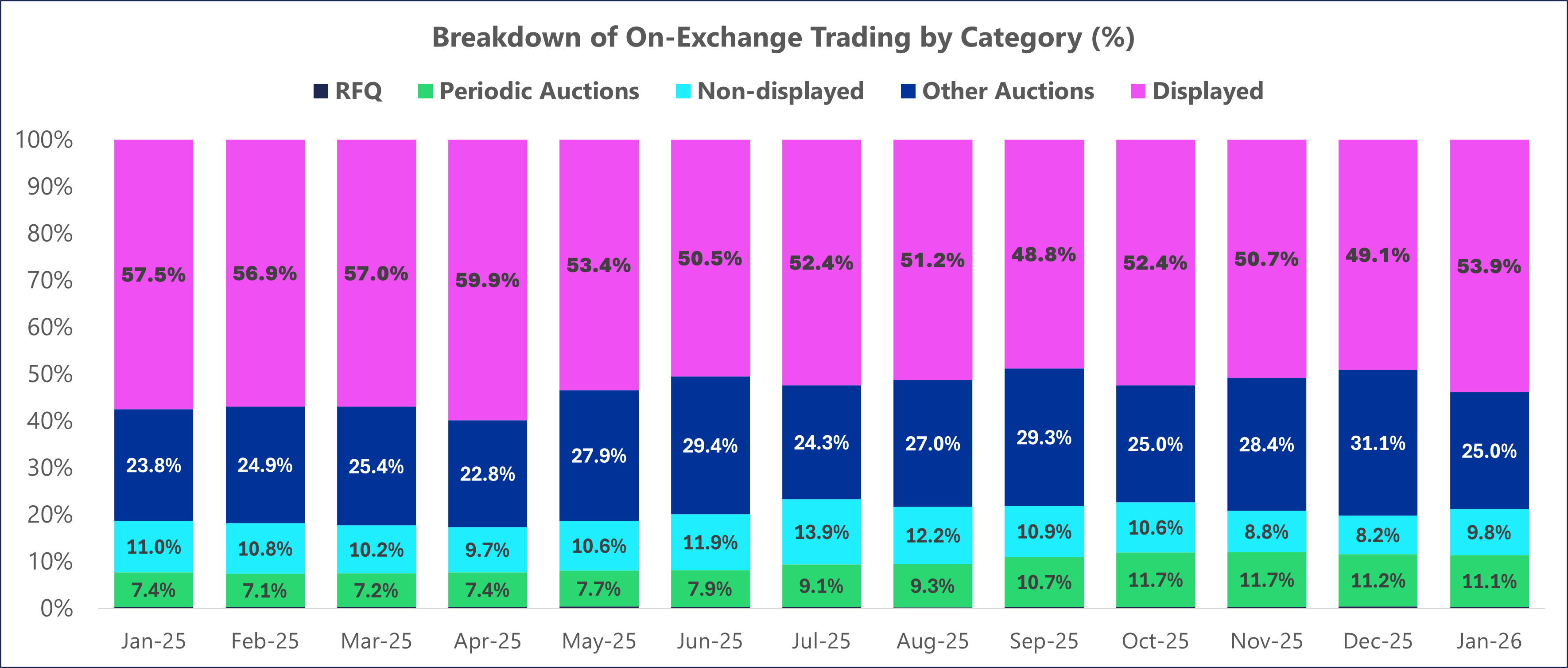 - Market-wide activity continued to shift away from open and closing auctions towards lit and dark order books. Lit order books accounted for 53.9% of on-exchange volumes, up from 49.1% in December 2025, marking their highest share since April 2025 (59.9%).