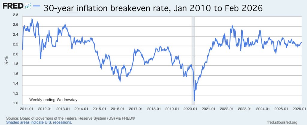 That’s a fairly high breakeven rate, but consistent with recent trends. Inflation over the last 30 years, ending in January, has averaged 2.5%.