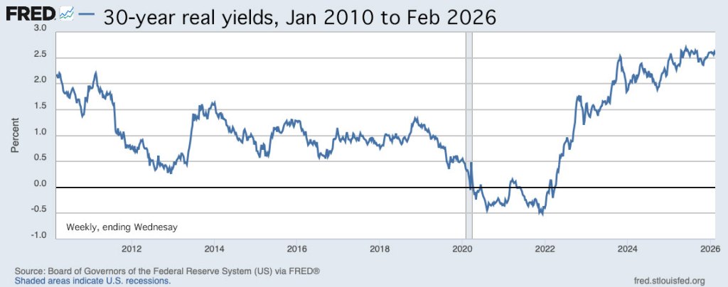 Here is the trend in the 30-year real yield over the last 16 years, showing the massive move higher since the Federal Reserve ended quantitative easing in 2022 and began raising short-term interest rates. During that time, federal deficits have also increased substantially.