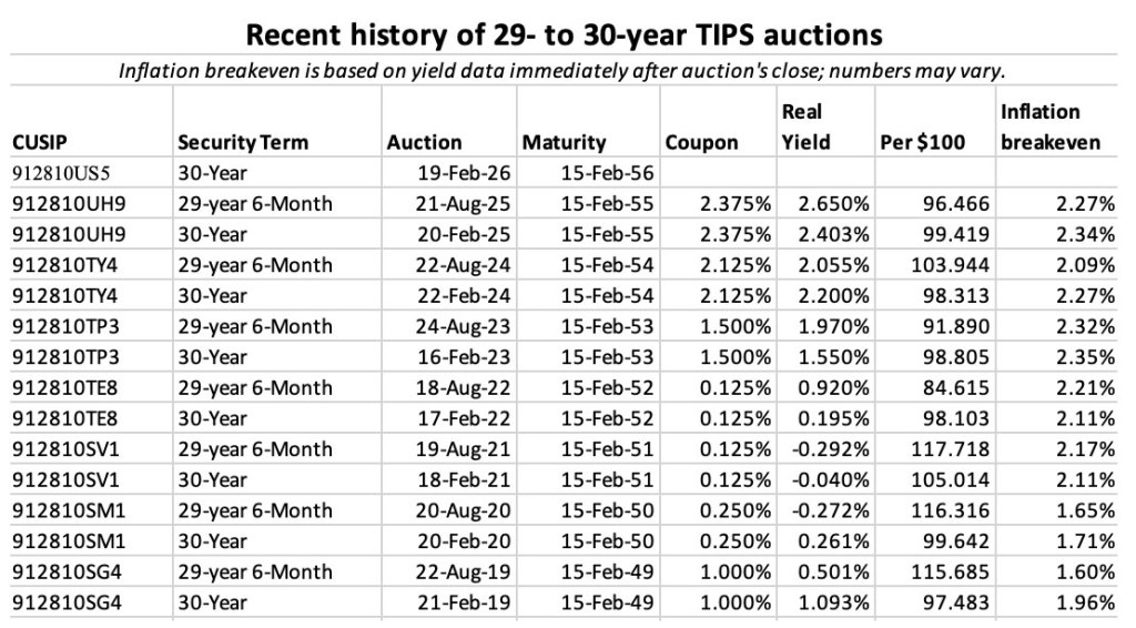 • For the right investor, this week’s 30-year TIPS auction will have appeal