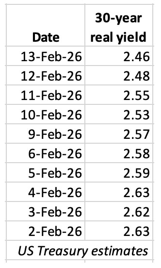 The 30-year real yield has been sinking a bit through the month of February, down about 17 basis points since February 2. But the current Treasury estimate of 2.46% remains historically attractive. In the last 16 years, only one TIPS auction of this term — last year’s August reopening — has generated a real yield that high.