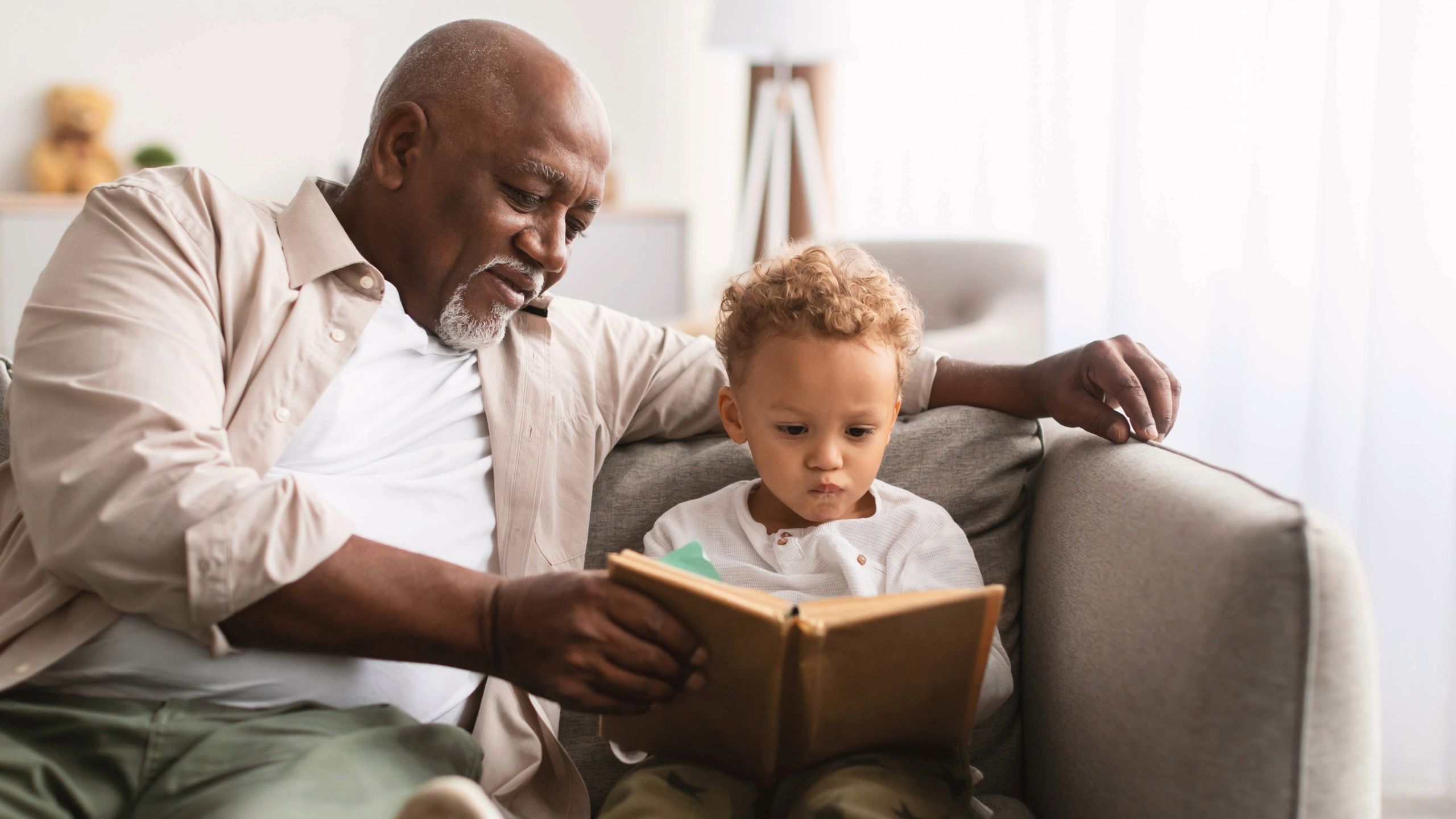Grandfather And Little Grandson Reading A Book Sitting Together On Sofa At Home