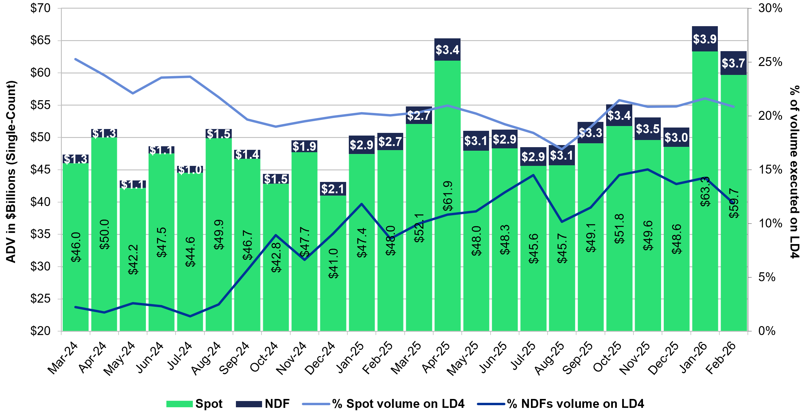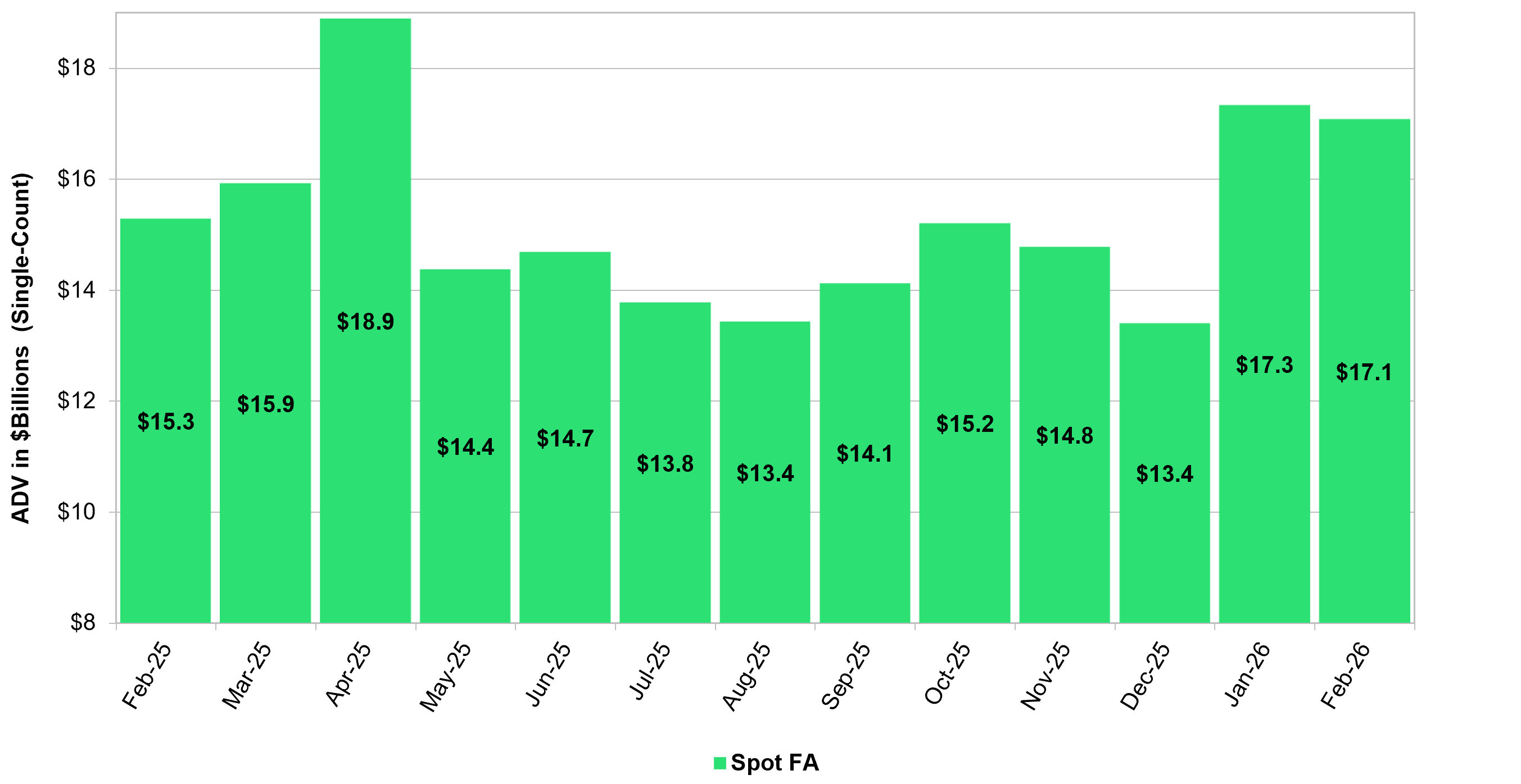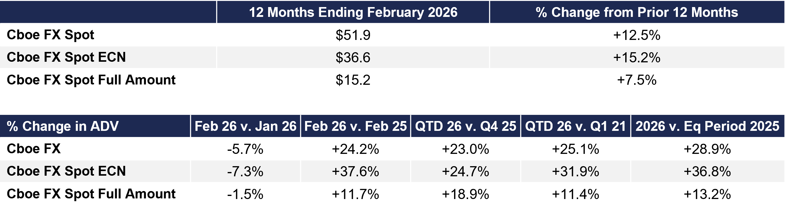 - In February 2026, Cboe FX Spot ADV reached $59.7 billion, a 24.2% increase from February 2025’s ADV of $48.0 billion.