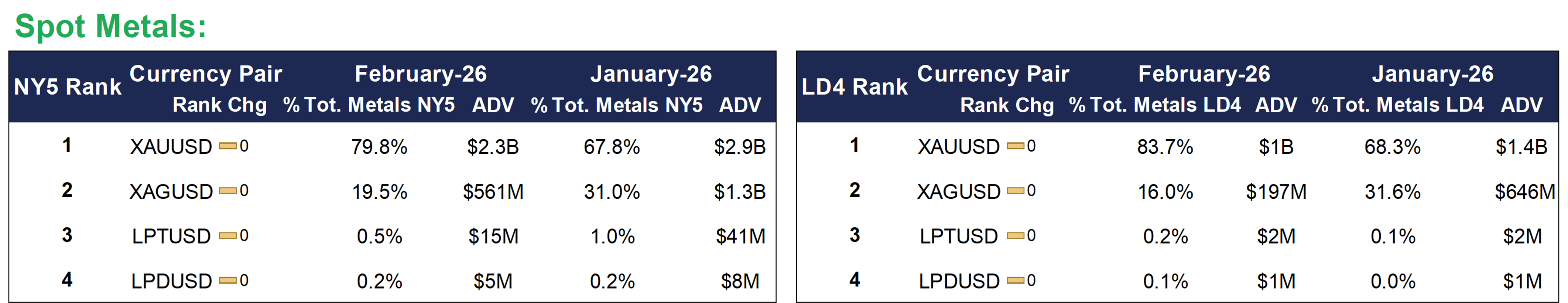 - At $3.9 billion, Cboe FX ECN Metals ADV accounted for 9.2% of the Spot ECN total, second only to January 2025’s Metals ADV of $6.1billion, and a 165.0% increase from $1.5 billion in February 2025.