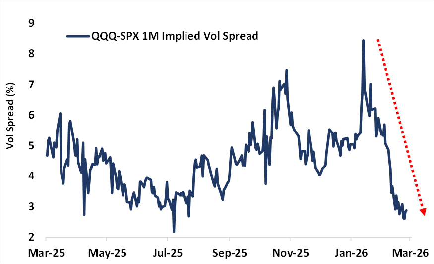 Chart: QQQ-SPX Vol Spread Nears a 1-Year Low