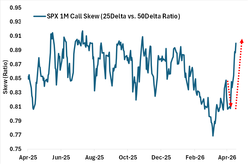 - When equities first bottomed out at the end of March, options traders were initially skeptical of the rally with most of the initial activity focused on fading the rebound. But since April 8th, that has changed dramatically. SPX 1M call skew, a measure of demand for upside calls, has surged from near a 1-year low to now the 90th percentile high on the back of FOMO (see chart below). Put skew, conversely, has fallen to the 15th percentile low with hedgers largely throwing in the towel.